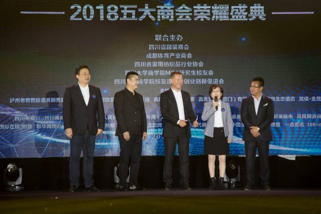 12月12日四川省服装商会联合成都体育产业商会、四川家用纺织品行业协会、四川大学商学院MBA研究生校友会、 四川大学商学院校友理事会创业创新促进会五大商协会以“跨界融合、创筑未来”为主题,举办“2018五大商会荣耀盛典”。 荣耀盛典在成都梦桐泉气膜体育馆隆重举行。社会各界名流,行业优秀代表,商会优秀代表亲临现场。 四川省工商联领导陈建女士为晚会致辞,她肯定了五大商协会跨界联盟在行业融合创新上的开创精神和重要作用, 鼓励五大商协会继续加深跨界融合,在促进行业间共融共通上探索新的发展之路,开启全新发展模式。 五大会长一起见证启动腾飞计划,助力梦想腾飞!五大商协会也将持续关注公益,关注体育事业, 利用联盟的融合力量,促进“腾飞”!五大商会将继续共建共享,打造合作平台,同舟共济,砥砺前行! 魅力荣耀 四川省服装商会的企业家们用最真的心、最深的情、最美艳的服装、为盛典上演了情景剧《我们的美好时代》。 活力的晨练、魅力的工作、高贵的晚宴,一动一静间表现出企业家格调与品位,洋溢着一种幸福、愉悦、积极的生活方式。